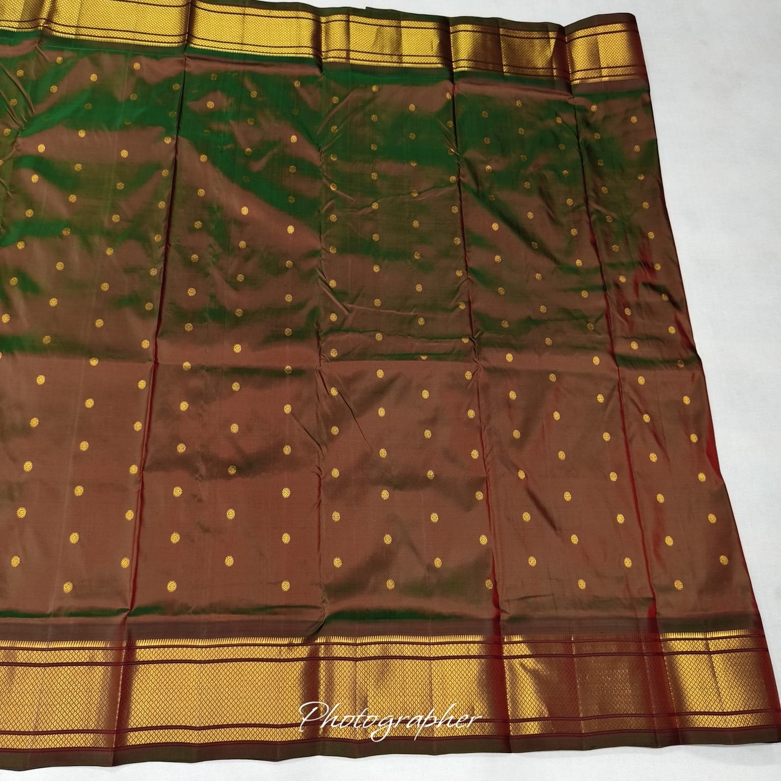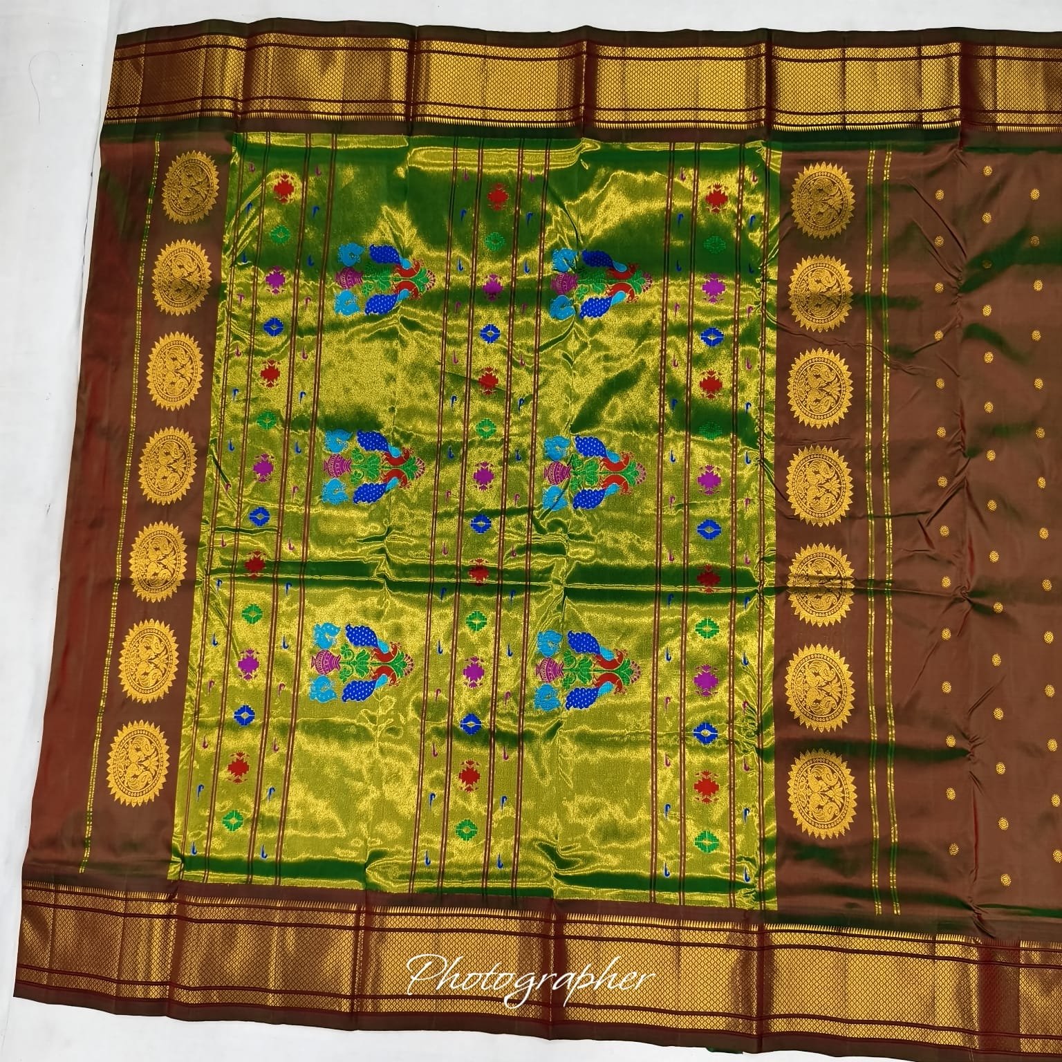 Accentuated with authentic Pathani zari work, the saree features elaborately woven motifs along the borders and pallu. Golden and copper-toned threads intertwine to depict intricate floral and paisley designs, adding depth and royal flair to the ensemble. The pallu stands out with detailed craftsmanship, designed to captivate with every movement.